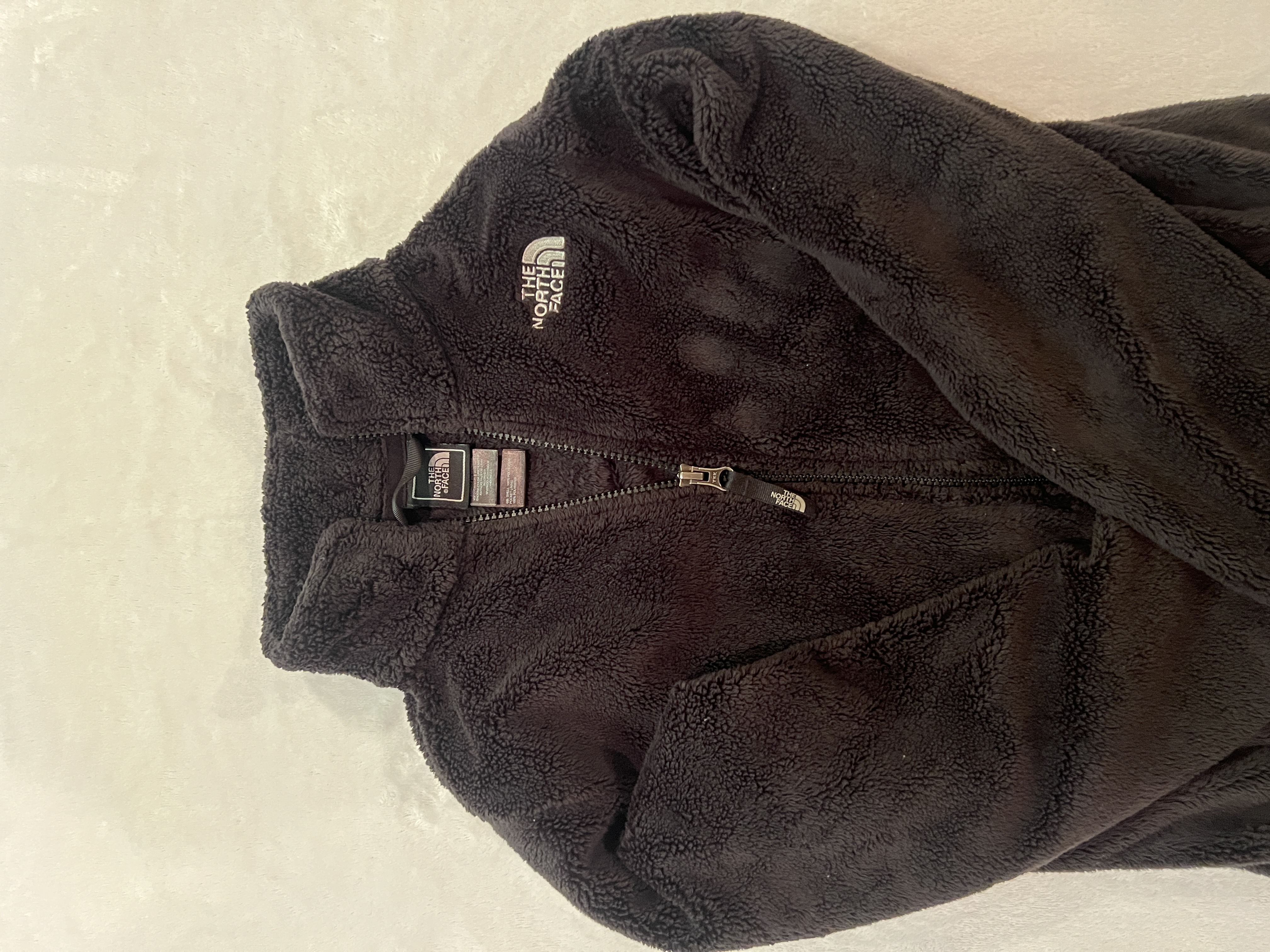 Stay warm and cozy with this The North Face fleece jacket, designed for girls. This dark gray jacket features a full front zipper, a high collar, and a soft, plush fleece interior. Ideal for layering or standalone wear, it’s in excellent pre-loved condition, perfect for outdoor adventures or casual wear.