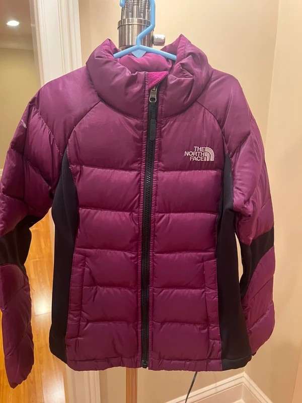 This stylish and cozy The North Face down jacket is perfect for keeping your child warm during the colder months. Designed for girls, this size 7/8 jacket features a vibrant purple color with black accents, a full front zipper, and a high collar for extra protection. Made with 100% recycled polyester and insulated with 70% down/30% feather fill, it offers excellent warmth and durability. Ideal for outdoor activities, this pre-loved jacket is in good condition.