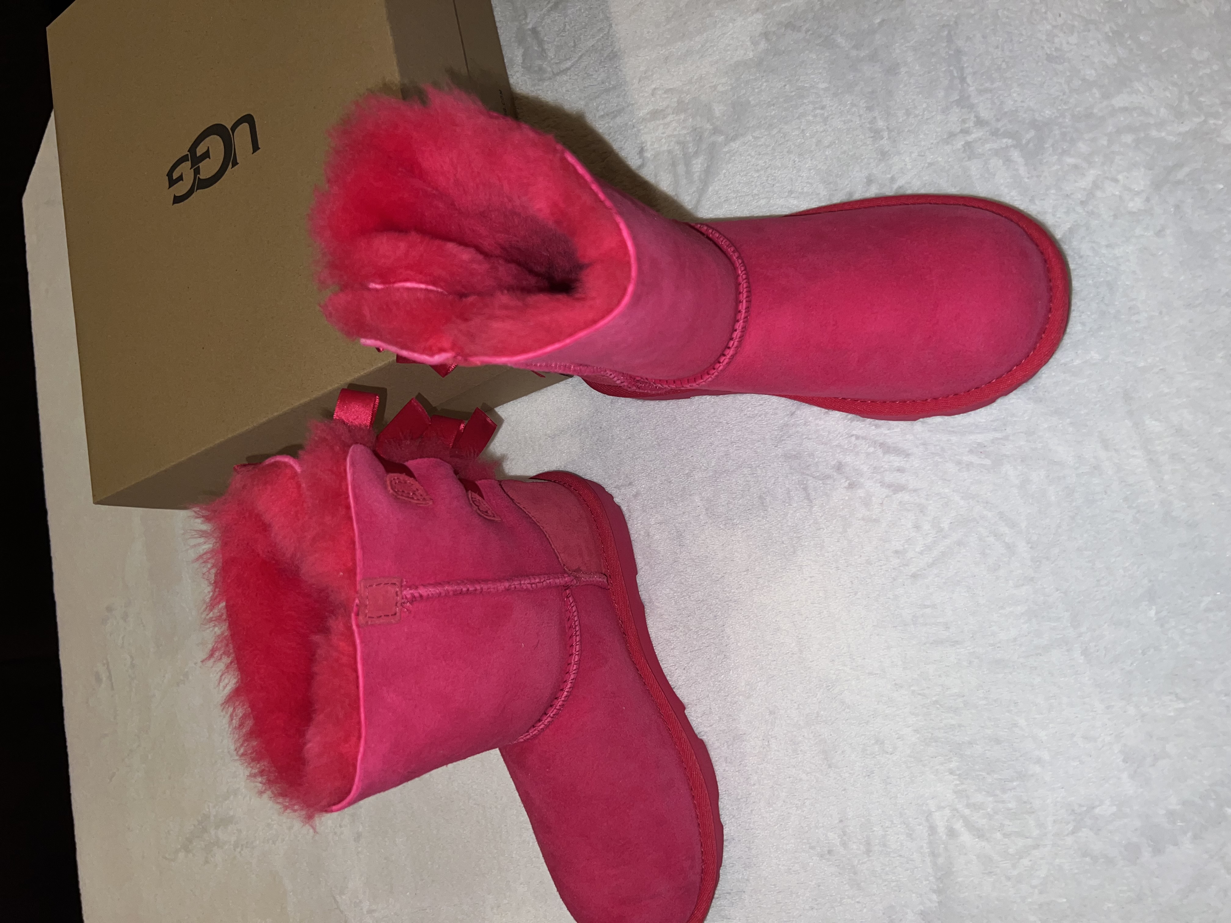 Adorable and cozy, these authentic UGG Bailey Bow II boots feature a vibrant hot pink suede exterior and plush sheepskin lining that keeps little feet warm and comfortable. The signature twin satin bows at the back add a charming touch, making these boots perfect for stylish cold-weather wear. Lightweight and durable with a Treadlite by UGG™ outsole for added cushioning and traction.