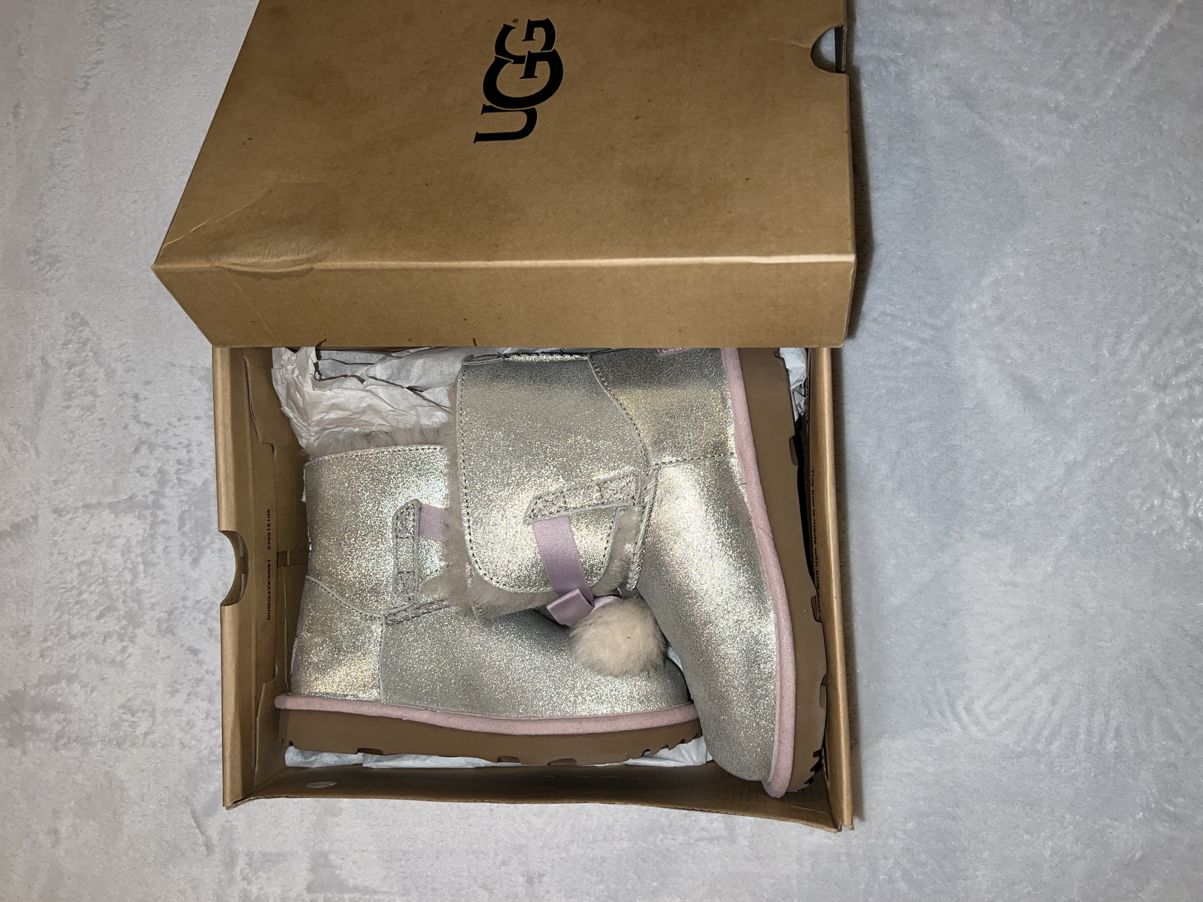 Keep your little one cozy and stylish with these adorable UGG Australia boots! Featuring a shimmering metallic silver exterior, soft pink trim, and cute lavender ribbon bows with plush pom-poms, these boots combine warmth and sparkle in one perfect pair. Fully lined with genuine sheepskin for comfort and insulation, they’re ideal for colder weather while adding a fun, fashionable touch.